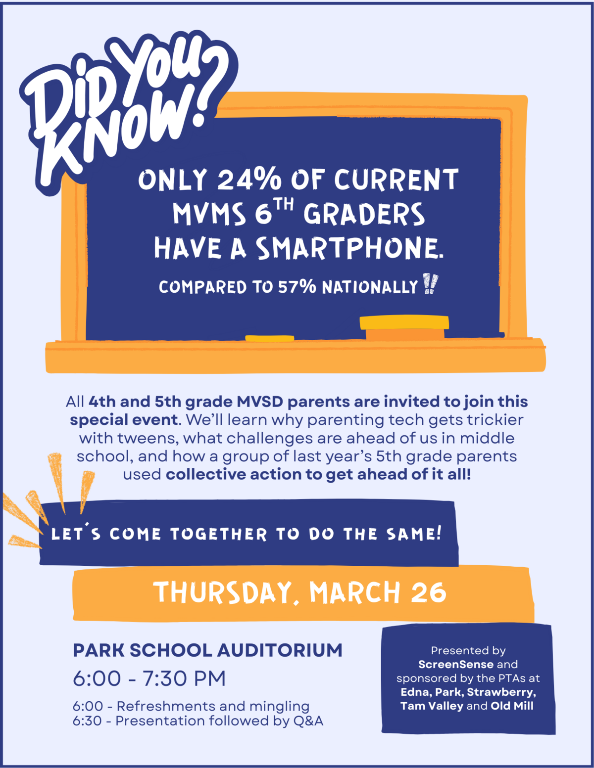 All 4th and 5th grade MVSD parents are invited to a special evening of connecting and community. We’ll learn why parenting tech gets trickier with tweens, what challenges are ahead of us in middle school, and how a group of last year’s 5th grade parents used collective action to get ahead of it all!